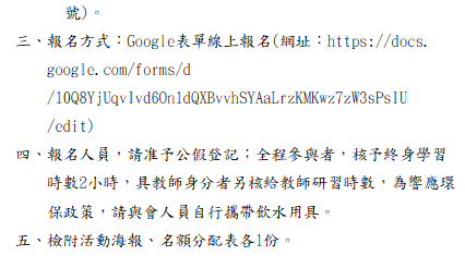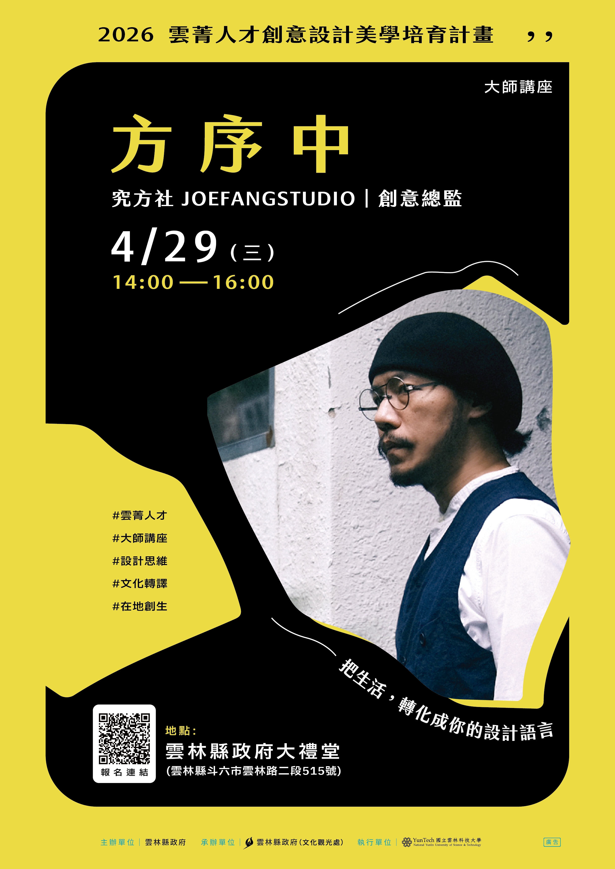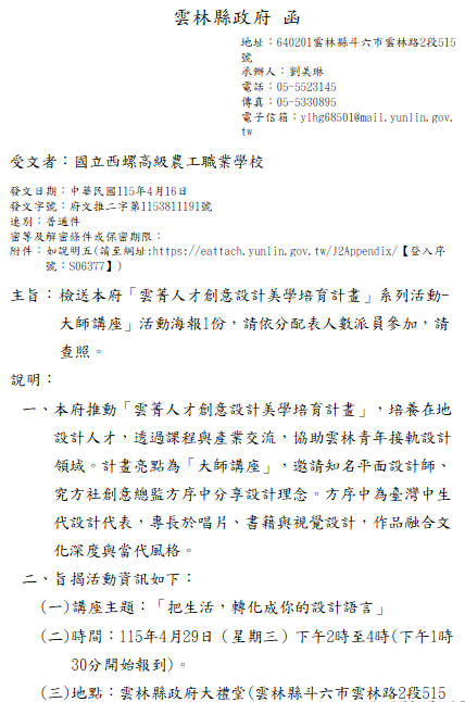 轉知-「雲菁人才創意設計美學培育計畫」系列活動-大師講座」活動大師講座海報下載 瀏覽次數: 3Post author:hlvs203Post published:2026-04-17Post category:研習活動Read more articles上一篇文章轉知-國教署「115年度SEL教師增能培力系列專題講座」(場次一)相關內容轉知~110年度全國高級中等學校性別平等教育議題融入教學教案設計甄選活動頒獎暨課程研討觀摩發表會2021-12-07國立臺灣師範大學「111學年度藝術群專業英文得獎教案分享」線上研習。2022-08-25