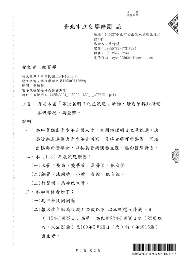 【轉知】臺北市立交響樂團辦理「第16屆明日之星甄選」活動教育部-函-5下載臺北市立交響樂團第16屆明日之星甄選簡章-1下載 瀏覽次數: 3Post author:hlvs302aPost published:2026-04-17Post category:學生訊息Read more articles上一篇文章【轉知】中央研究院參與「臺灣橋梁計畫」(TAIWAN BRIDGES)邀請諾貝爾獎得主梶田隆章(Takaaki Kajita)教授蒞院發表專題演講下一篇文章【轉知】國立臺中科技大學商業經營系舉辦「第七屆創出名堂企劃實作競賽」要點及海報相關內容朝陽科技大學應用英語系辦理「大學生活一日營」之活動簡章及海報(附件1、2)各1份2025-04-24【轉知】2025全國火星任務創意競賽2025-10-03