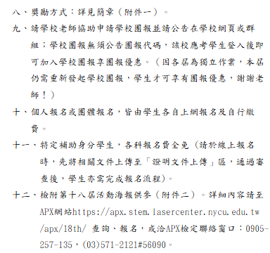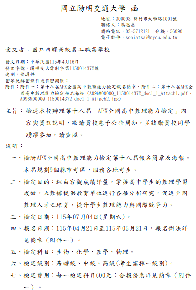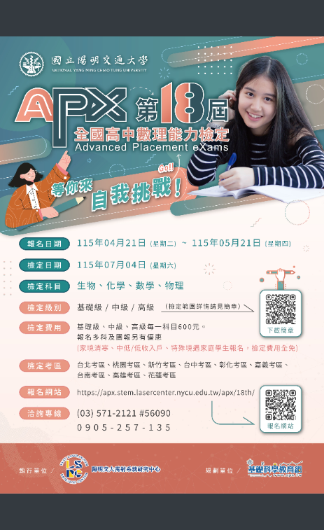 轉知-國立陽明交通大學辦理第十八屆「APX全國高中數理能力檢定」第十八屆「APX全國高中數理能力檢定」下載第十八屆「APX全國高中數理能力檢定」_Attach1下載第十八屆「APX全國高中數理能力檢定」-文下載 瀏覽次數: 5Post author:hlvs203Post published:2026-04-17Post category:學生訊息 / 宣導資訊 / 教職員公告Read more articles上一篇文章轉知-國立清華大學辦理「2026國立清華大學清華光罩教學獎」甄選相關內容113-1全校暑期加深加廣課程家長同意書,請未繳回的學生自行下載使用。2024-09-02為提升行政效能,公立學校教職員退休證將改以數位形式製發2024-02-01
