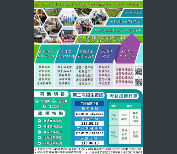 國立臺東專科學校115年度進修二年制「園藝暨景觀副學士學位學程」公費專班招生簡章及海報國立臺東專科學校115年度進修二年制「園藝暨景觀副學士學位學程」公費專班招生簡章及海報1下載國立臺東專科學校115年度進修二年制「園藝暨景觀副學士學位學程」公費專班招生簡章及海報2下載 瀏覽次數: 3Post author:輔導室Post published:2026-04-22Post category:學生訊息 / 校園公告Read more articles上一篇文章轉知-國立陽明交通大學辦理第十八屆「APX全國高中數理能力檢定」下一篇文章協助青少年探索未來職涯方向─十八學群職涯導覽核心素養公益講座相關內容國立嘉義大學農場管理進修學士學位學程農業公費專班招生2026-01-06【轉知】114年度草地野餐日2025-10-03