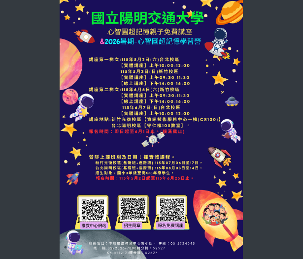 【轉知】國立陽明交通大學推廣教育中心辦理暑期「心智圖超記憶親子免費講座」及「2026暑期-心智圖超記憶學習營」招生簡章國立陽明交通大學-函下載2026-暑期-心智圖超記憶學習營招生簡章下載 瀏覽次數: 1Post author:hlvs302aPost published:2026-04-22Post category:學生訊息Read more articles上一篇文章【轉知】國立中興大學辦理115年暑期「 ACP國際證照(Photoshop及Illustrator)」課程招生資訊1份相關內容2023年觀光、國際禮儀及自媒體專業認證冬季大會考2023-09-20國立臺灣海洋大學特殊選才招生考試相關資訊,歡迎同學報考。2024-10-07