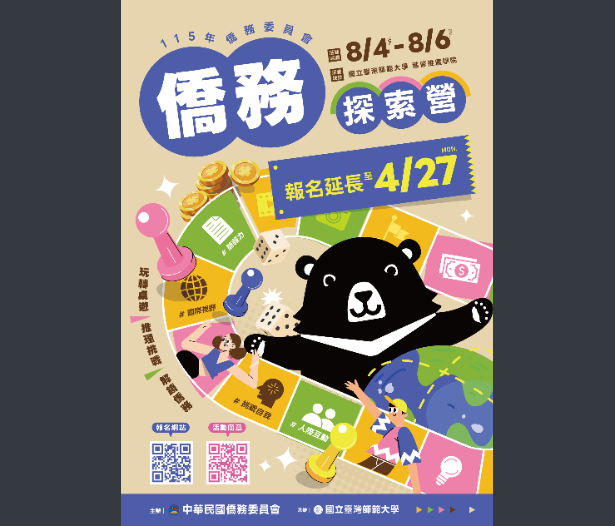 【轉知】國立臺灣師範大學「115年僑務探索營」延長報名至115年4月27日止國立臺灣師範大學-函-1下載僑務委員會115年僑務探索營報名簡章下載 瀏覽次數: 5Post author:hlvs302aPost published:2026-04-23Post category:學生訊息Read more articles上一篇文章【轉知】國立嘉義大學於暑假期間舉辦「2026嘉大資管探索營-MISs FinVibe 2026」活動海報乙份下一篇文章【轉知】教育部委辦國立臺灣藝術大學「第13屆MATA獎影像培力工作坊」招生簡章及海報電子檔各1份相關內容全國高中生抗疫競賽2021-11-08【Ace家族 2022島語文化夏令營】團隊夥伴招募計畫2022-05-24