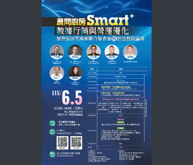 【轉知】國立高雄餐旅大學餐飲管理系舉辦晨間廚房 Smart+ 數據行銷與營運優化-實務型研究專案聯合發表會暨智慧餐飲論壇國立高雄餐旅大學-函下載 瀏覽次數: 12Post author:hlvs302aPost published:2026-04-27Post category:學生訊息Read more articles上一篇文章【轉知】東海大學財務金融研訓中心謹訂於115年7月13~16日 (星期一~四)針對全國高中(職)生辦理4天3夜『第二十五屆東海財金巴菲特成長營』下一篇文章【轉知】教育部國民及學前教育署轉型正義教育資源中心辦理115年度「《大濛》電影放映暨座談會」研習活動相關內容【轉知】臺北醫學大學辦理「暑期高中志工服務員招募活動」2026-03-05111學年度國立台灣體育運動大學單獨招生2022-01-07