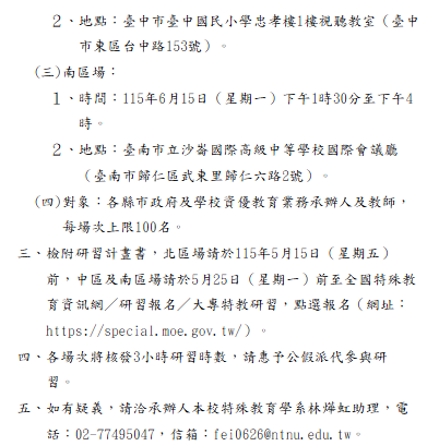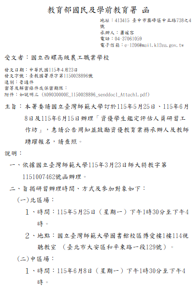 轉知-國立臺灣師範大學辦理「資優學生鑑定評估人員研習工作坊」資優學生鑑定評估人員研習工作坊_Attach1下載 瀏覽次數: 8Post author:hlvs203Post published:2026-04-27Post category:研習活動Read more articles上一篇文章教育部辦理校園開放文件格式(ODF)競賽」請全校師生踴躍報名參加下一篇文章轉知-「共織正義:回望原住民族歷史正義與轉型正義教育實踐論壇」相關內容國立公共資訊圖書館將美感素養結合108課綱辦理「如何以繪本說出好故事:圓夢繪本創作融入自主學習線上課程」,請踴躍報名參加2024-11-11台灣電影研究中心為推廣影像教育,將於2022年10月16日舉辦「2022電影《妹妹》教師研習暨教具包分享會」,鼓勵教師踴躍報名。2022-09-19