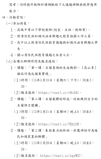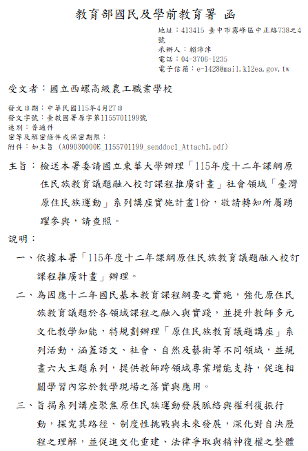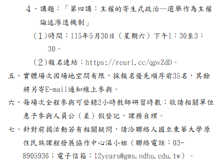 轉知-國立東華大學辦理「115年度十二年課綱原住民族教育議題融入校訂課程推廣計畫」社會領域「臺灣原住民族運動」系列講座社會領域「臺灣原住民族運動」系列講座實施計畫_Attach1下載 瀏覽次數: 10Post author:hlvs203Post published:2026-04-28Post category:研習活動Read more articles上一篇文章轉知-「離島地區發掘與輔導資優學生知能研習工作坊」相關內容國立政治大學中國文學系國文教學碩士在職專班111學年度招生訊息(詳附件或以下連結:http://ctma.nccu.edu.tw),為提供學校教師進修學習之管道,請同仁踴躍報名。2021-11-05『碳定價與我們的關係』環境教育講座2024-09-26