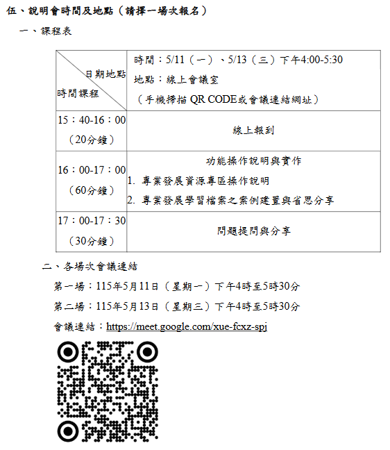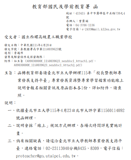 轉知-臺北市立大學辦理115年「校長暨教師專業發展支持平臺」專業發展資源暨專業學習檔案功能線上說明會報名方式:請協助函轉相關訊息予所屬學校:請於115年5月11日(星期一)中午前填復線上報名表單,網址為:https://forms.gle/PrVDY1pypteGXj3R7「校長暨教師專業發展支持平臺」專業發展資源暨專業學習檔案功能線上說明會-文下載「校長暨教師專業發展支持平臺」專業發展資源暨專業學習檔案功能線上說明會_Attach1下載「校長暨教師專業發展支持平臺」專業發展資源暨專業學習檔案功能線上說明會_Attach2下載 瀏覽次數: 10Post author:hlvs203Post published:2026-04-28Post category:宣導資訊 / 教職員公告Read more articles上一篇文章賀!本校參加全國高級中等學校114學年度第2學期小論文寫作比賽得獎同學下一篇文章114-115年度COVID-19疫苗接種計畫相關內容轉知「國立中央大學公開徵求附屬中壢高級中學第四任校長候選人啟事2025-02-18轉知-115年度「高級中等學校第二外語教育推動計畫」電子報徵文2026-03-24