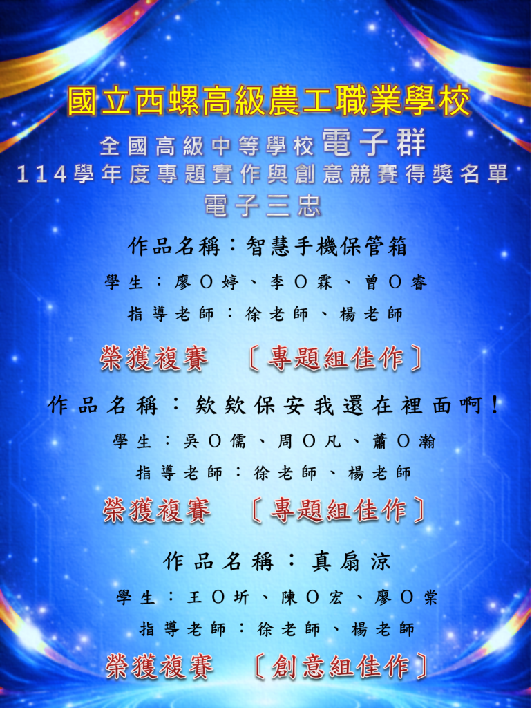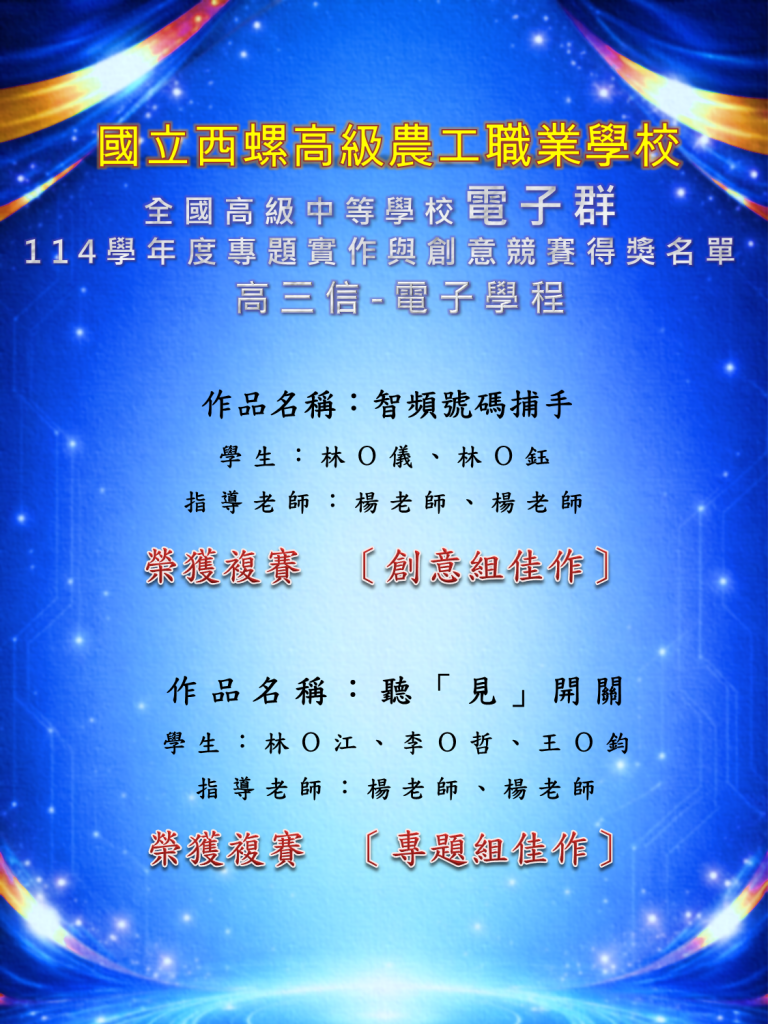 教育目標課程地圖教學團隊教學環境國立榜單技能競賽榜單多元活動剪影相關網站連結全國技能競賽全國工科技藝競賽恭喜電子三鍾國勝同學參加112學年度工業類科技藝競賽數位電子職群榮獲優勝 恭喜電子三廖容陞同學參加112學年度工業類科技藝競賽工業電子職群榮獲優勝專題競賽恭喜高三孝電子學程同學參加2024光宇盃全國高中職專題競賽榮獲第二名恭喜高三孝電子學程同學參加2024光宇盃全國高中職專題競賽榮獲特別獎 瀏覽次數: 377
